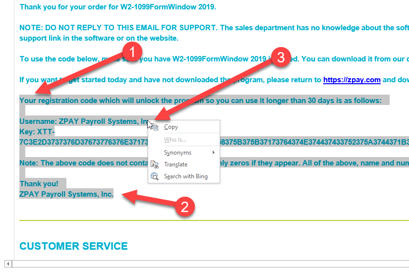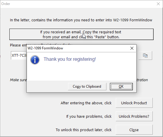 When you purchase you will be given the Key to unlock the software so all features will work that were locked in the Trial version. The screenshot below is what you will see. You will also receive an email with the same information.