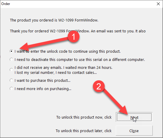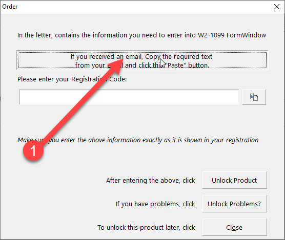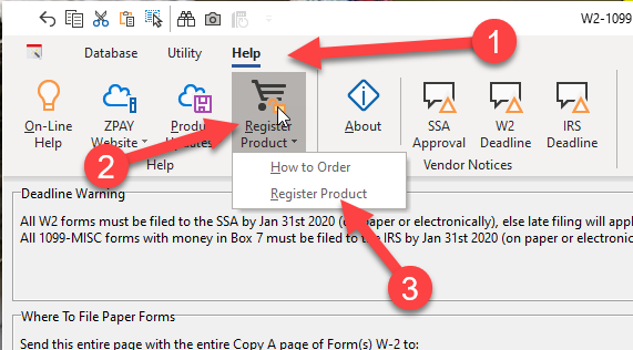 The Start W2-1099FormWindow and Click Help number 1, then the Register Product button number 2 and finally Register Product in the drop menu item 3.