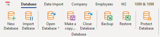 Import Database will allow you to Import a Database from a ".w2a" or a ".f1a" file exported from PayWindow.